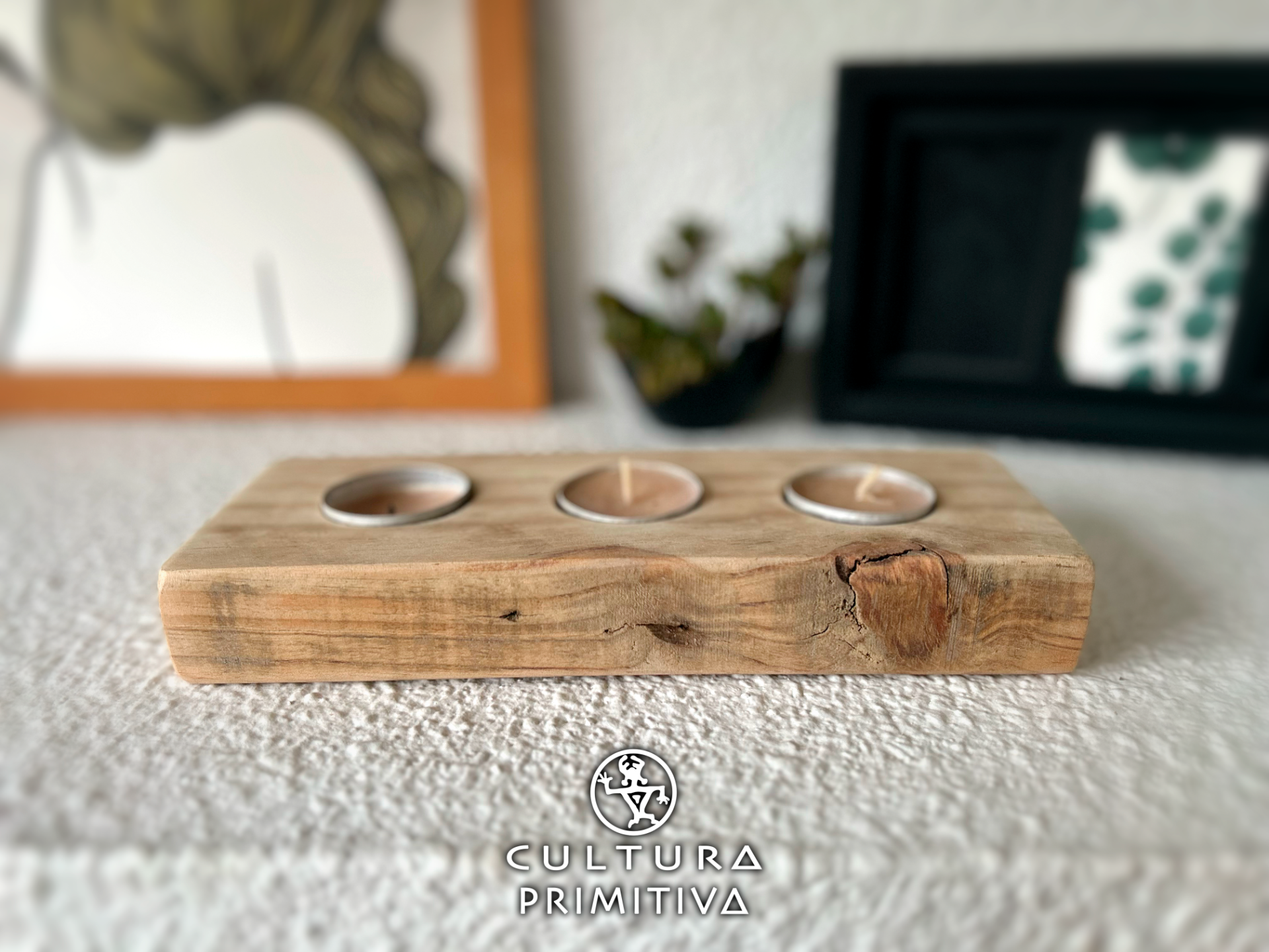 Portavelas Rústico artesanal hecho con madera 100% reciclada. Incluye 3 velas de té.